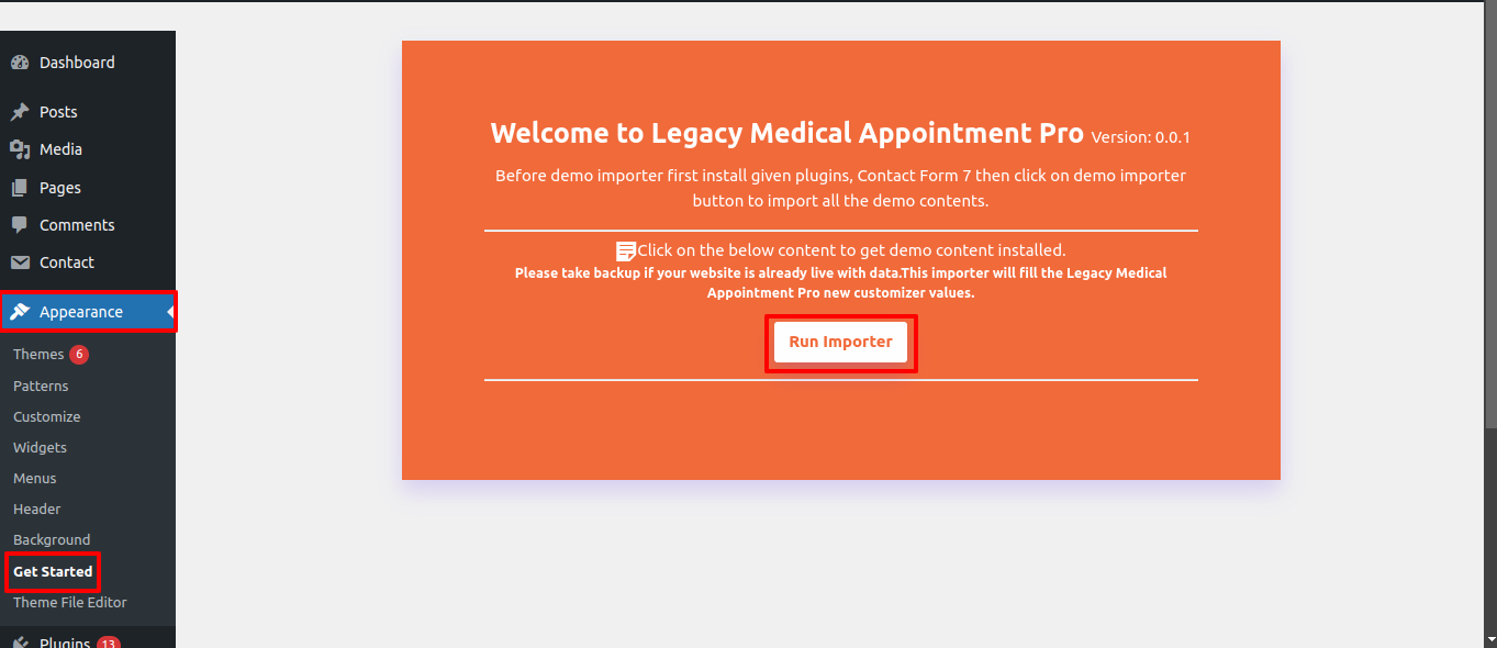 First Move ~ Refer to the "Dashboard" ~> then pick "Appearance" ~> afterwards "Get Started" ~> simply press "Run Importer" .