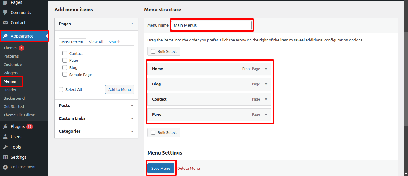 - Give the menu a name according to the the menu option Name column, and then hit Save.