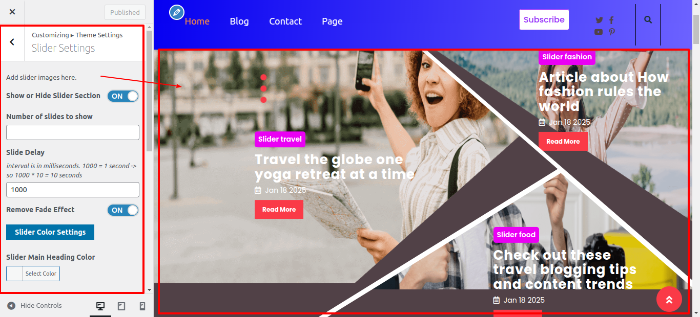 First Move ~ Refer to the "Dashboard" ~> then pick "Appearance" ~> afterwards "Customizing" ~> then Jump to "Theme Settings" ~> and finally arrive at the "Slider Settings" ~> simply press "Published" .