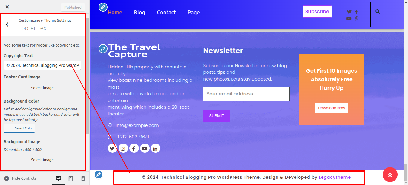 First Move ~ Refer to the "Dashboard" ~> then pick "Appearance" ~> afterwards "Customizing" ~> then Jump to "Theme Settings" ~> and finally arrive at the "Footer Text" ~> simply press "Published" .