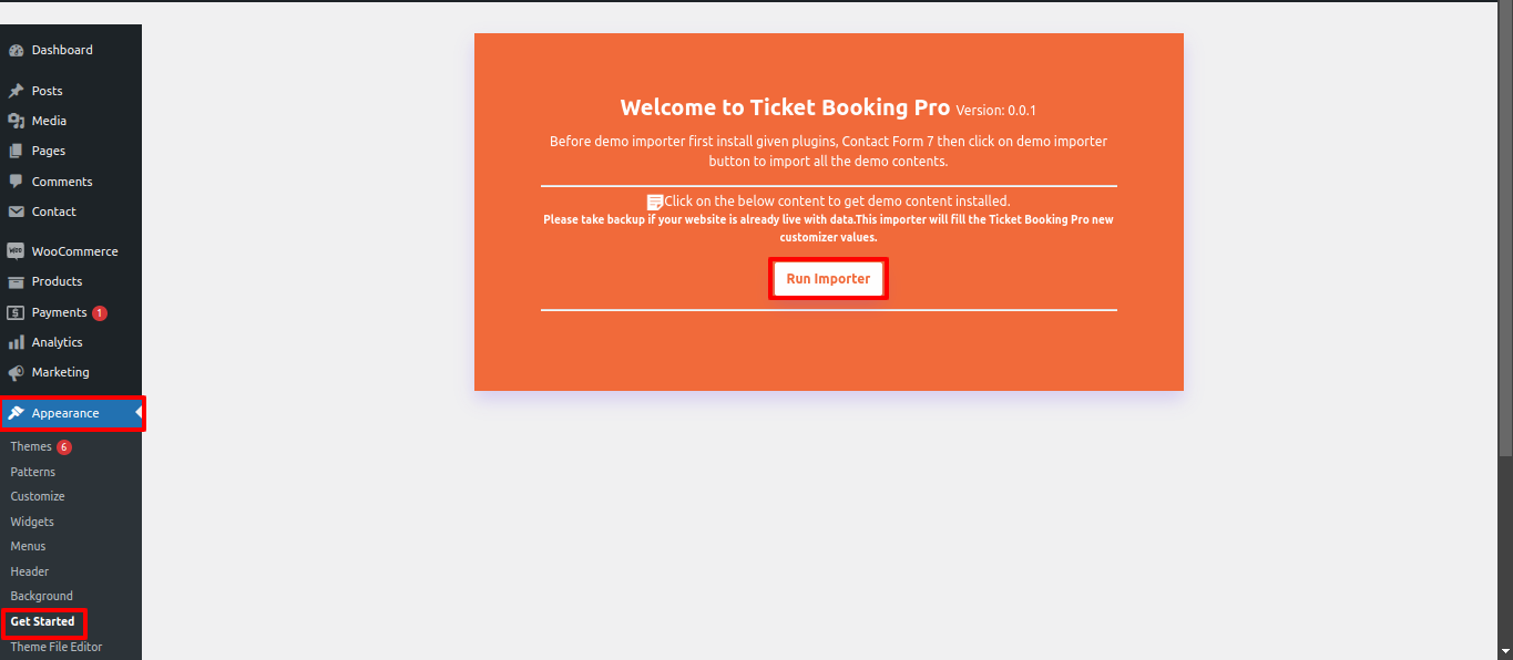 First Move ~ Refer to the "Dashboard" ~> then pick "Appearance" ~> afterwards "Get Started" ~> simply press "Run Importer" .