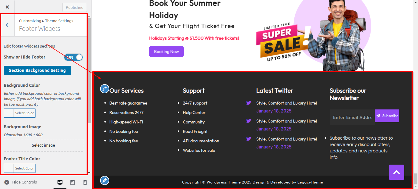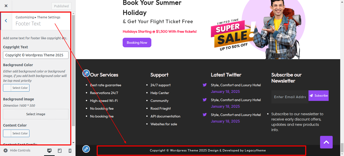 First Move ~ Refer to the "Dashboard" ~> then pick "Appearance" ~> afterwards "Customizing" ~> then Jump to "Theme Settings" ~> and finally arrive at the "Footer Text" ~> simply press "Published" .