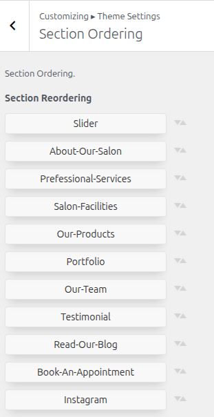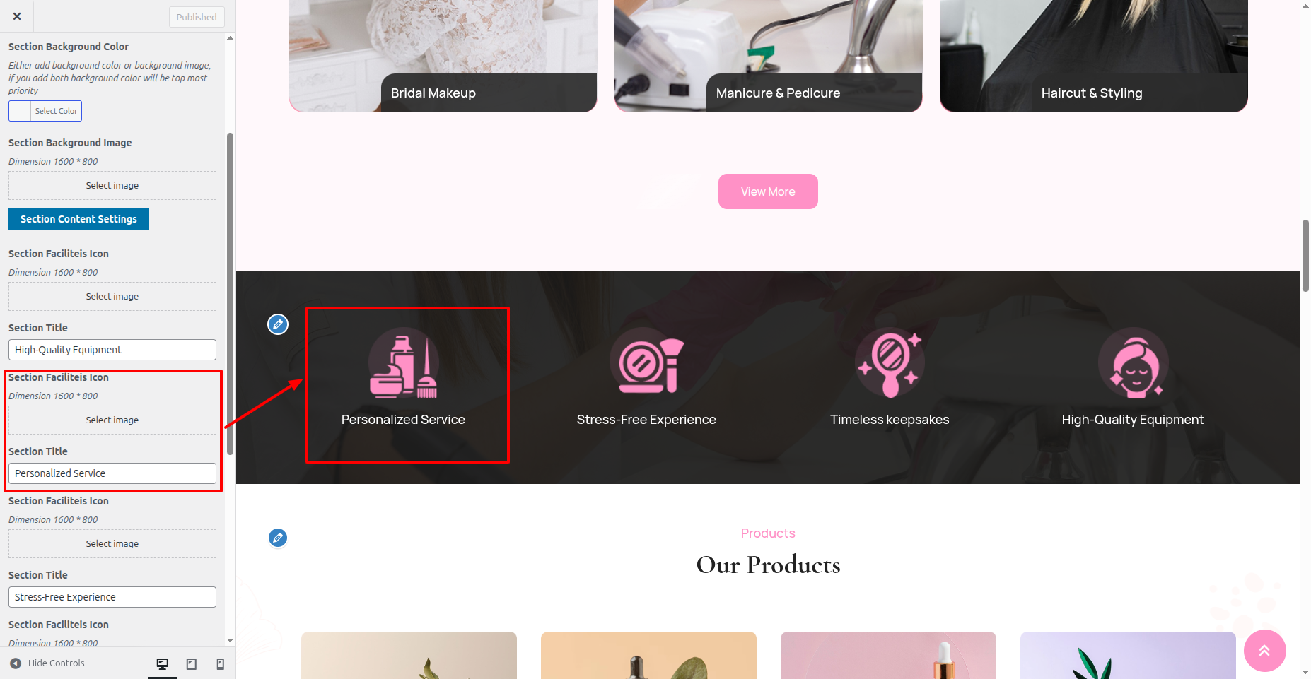 First Move ~ Refer to the "Dashboard" ~> then pick "Appearance" ~> afterwards "Customizing" ~> then Jump to "Theme Settings" ~> and finally arrive at the "Salon Facilites Section" ~> simply press "Published" .