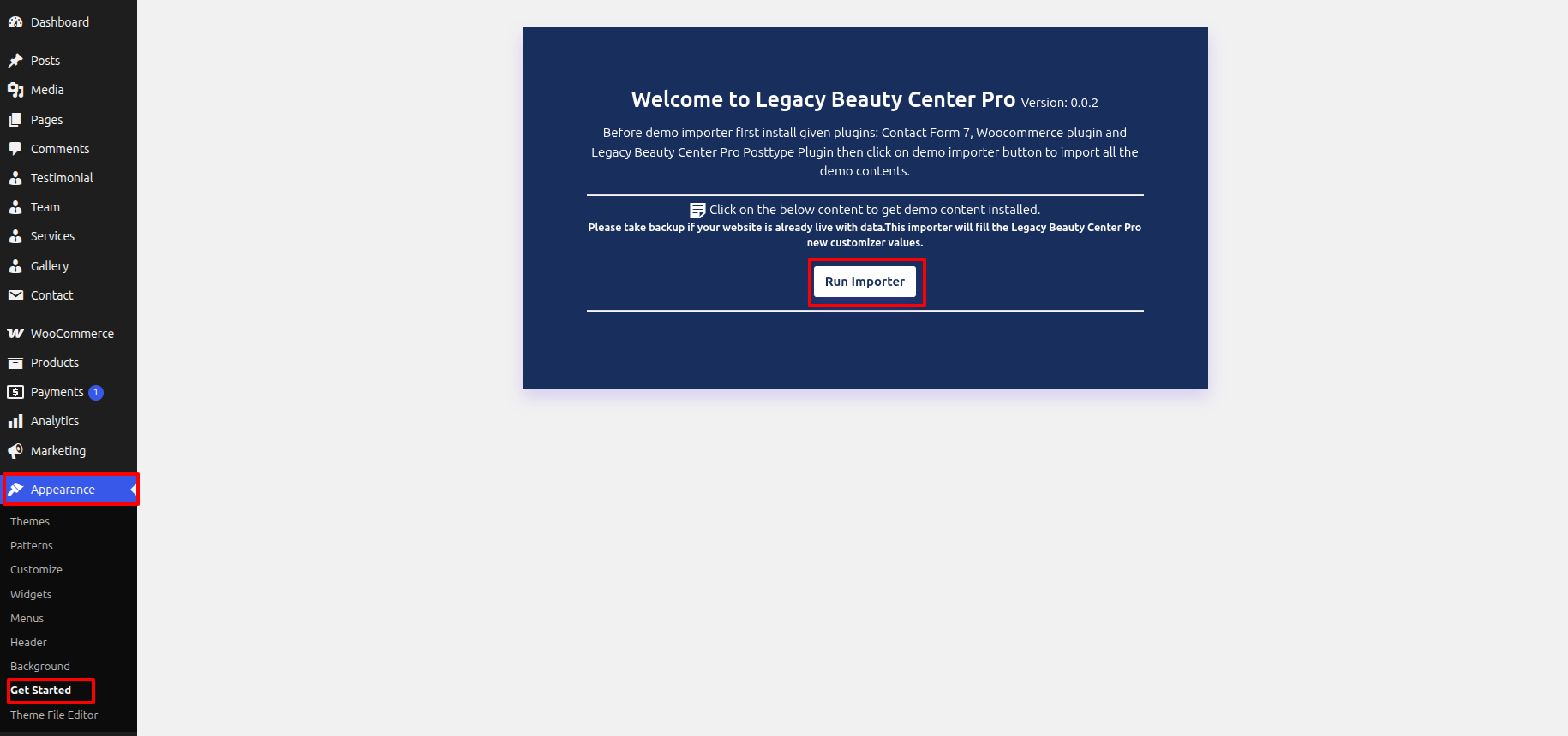 First Move ~ Refer to the "Dashboard" then pick "Appearance" ~> then pick "Get Started" ~> simply press "Run Importer" .