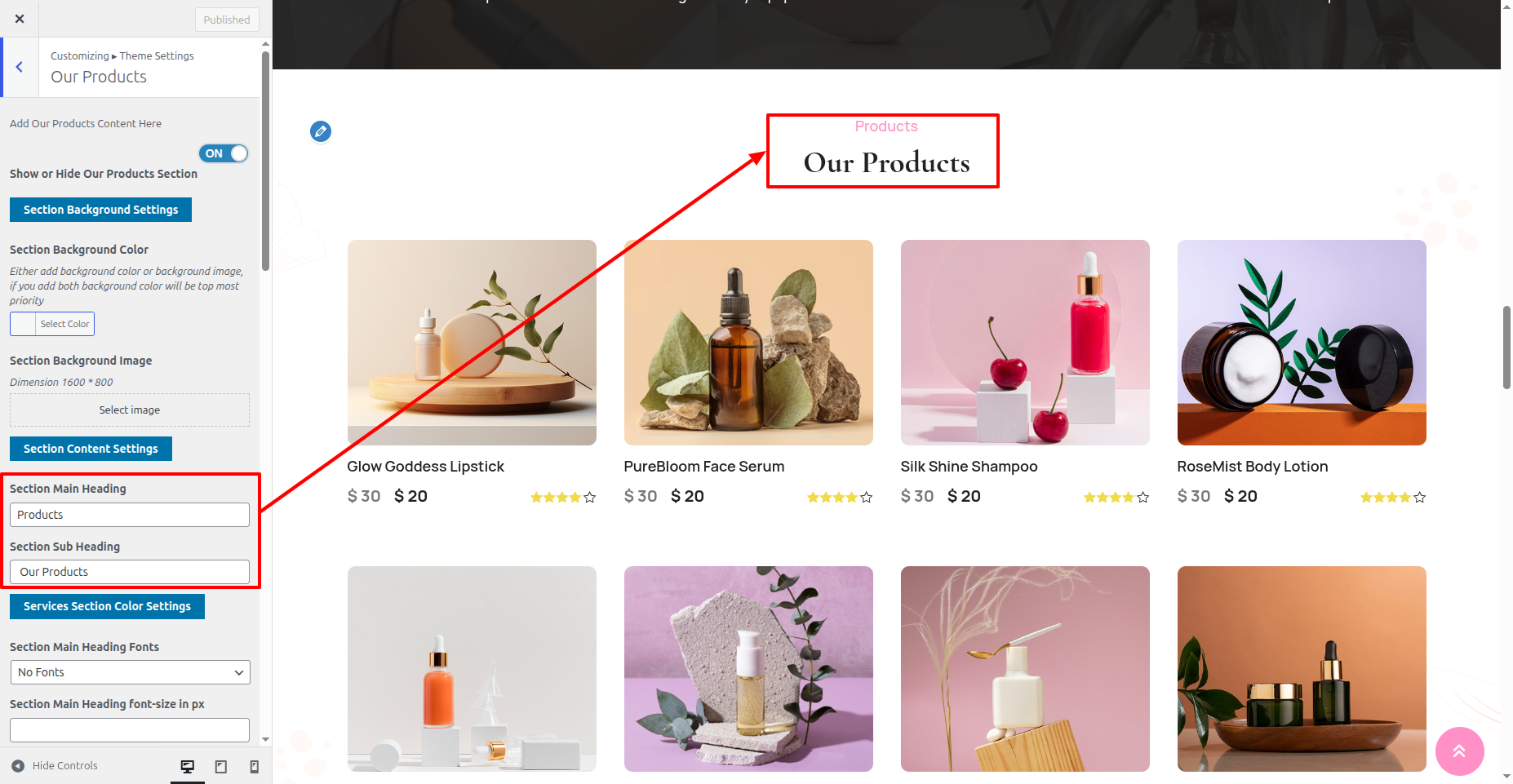 Second Move ~ Refer to the "Dashboard" ~> then pick "Appearance" ~> afterwards "Customizing" ~> then Jump to "Theme Settings" ~> and finally arrive at the "Our Products Section" ~> simply press "Published" .