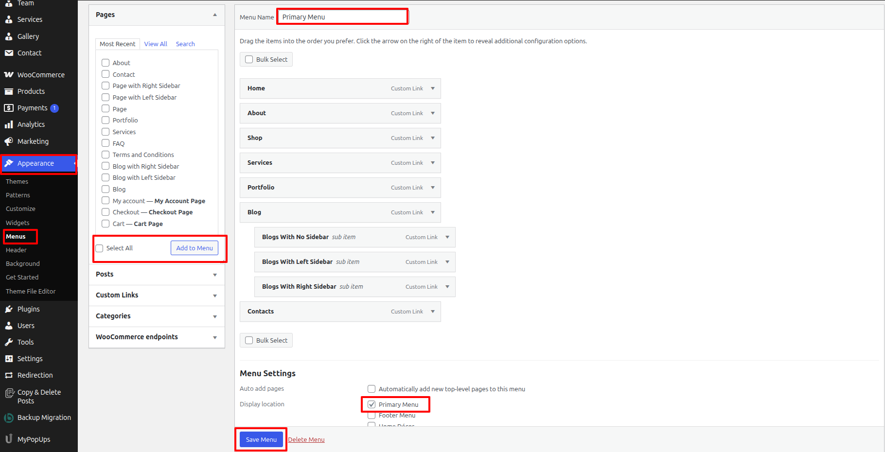 - After a navigation bar is established, mark the appropriate checkbox to choose the pages you would like to include. You must drag the necessary section to rearrange the parts.