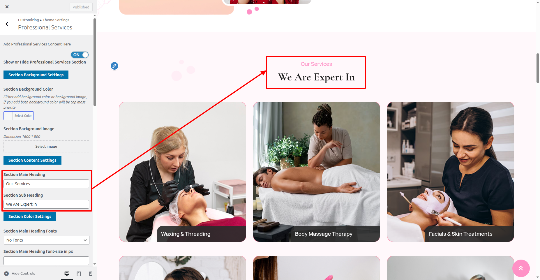 Second Move ~ Refer to the "Dashboard" ~> then pick "Appearance" ~> afterwards "Customizing" ~> then Jump to "Theme Settings" ~> and finally arrive at the "Professional Services Section" ~> simply press "Published" .