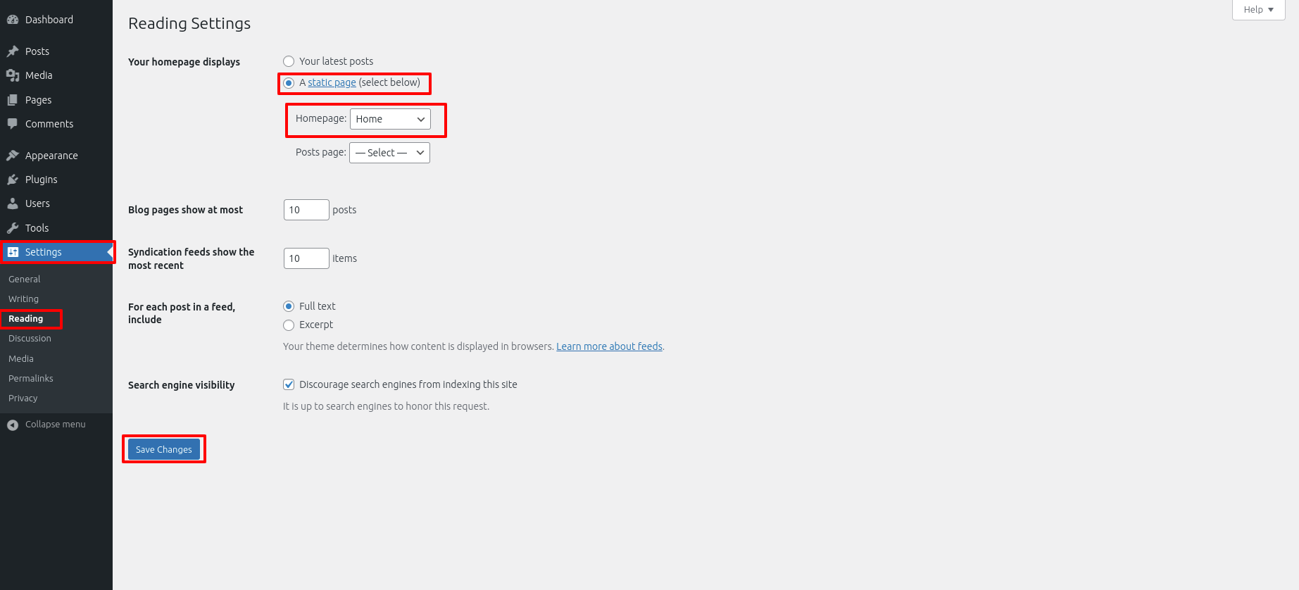 Second Move ~ Refer to the "Dashboard" ~> then pick "Settings" ~> afterwards "Reading" ~> and finally arrive at the " A static page" ~> simply Select "Home" ~> simply press "Published" .