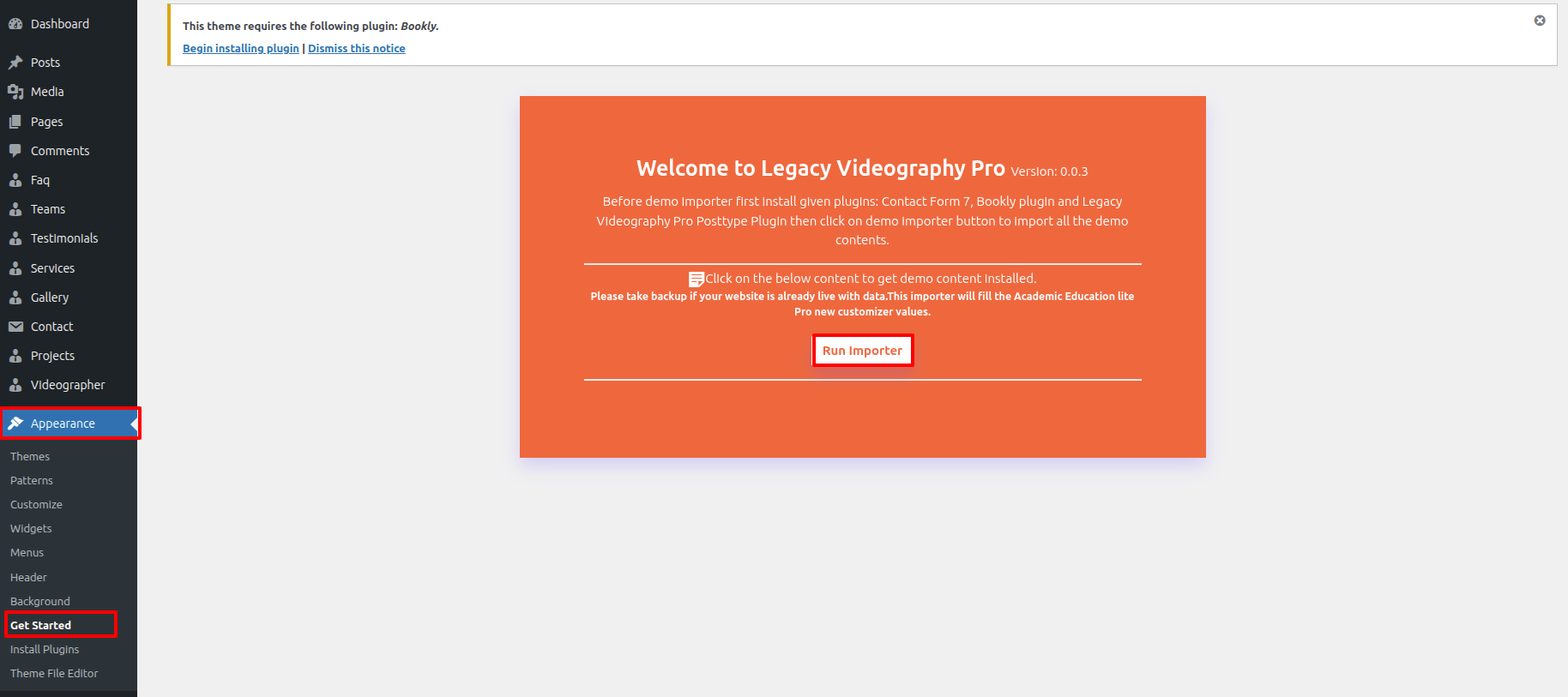First Move ~ Refer to the "Dashboard" then pick "Appearance" ~> then pick "Get Started" ~> simply press "Run Importer" .