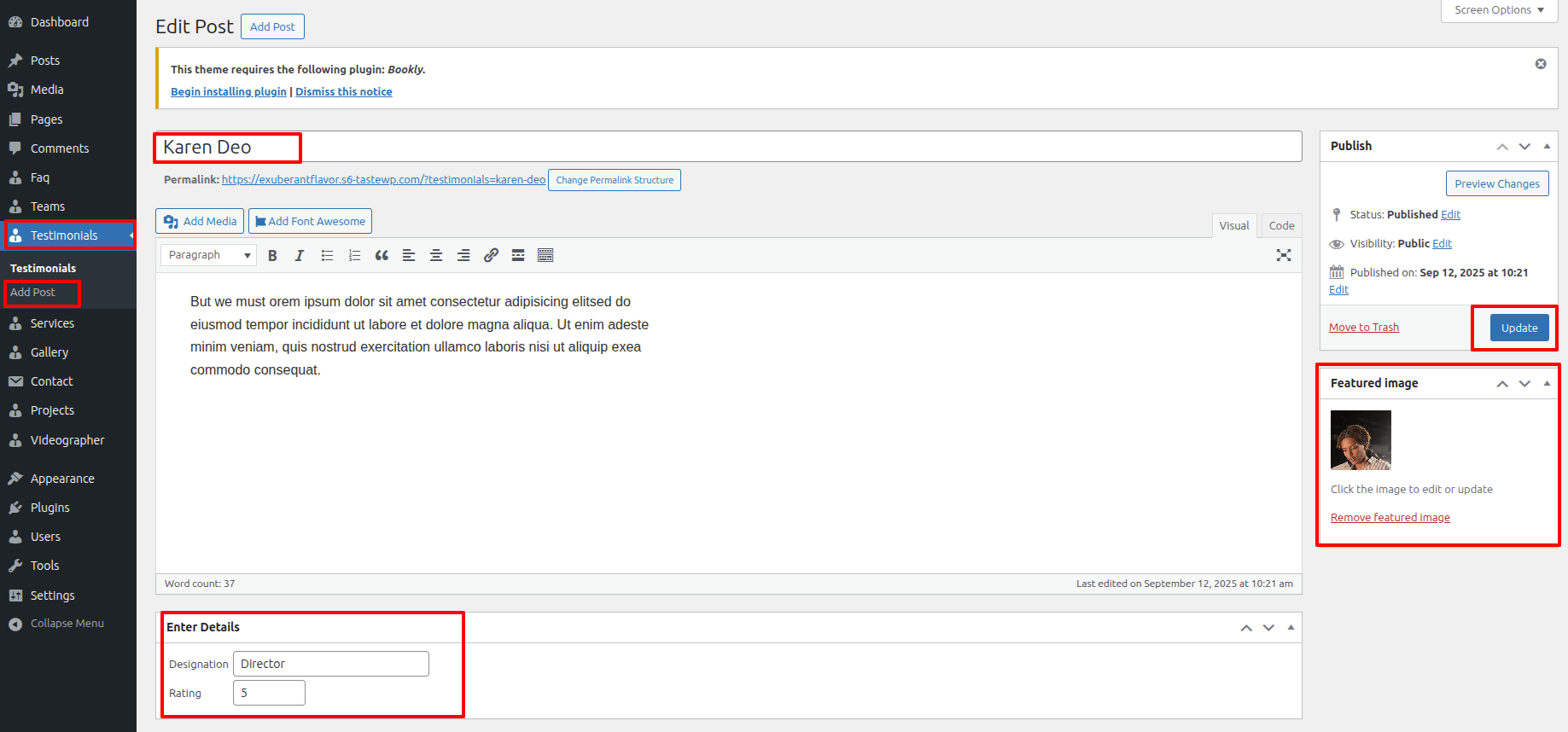 First Move ~ Refer to the "Dashboard" ~> then pick "Testimonial" ~> and finally arrive at the "Add Posts" .