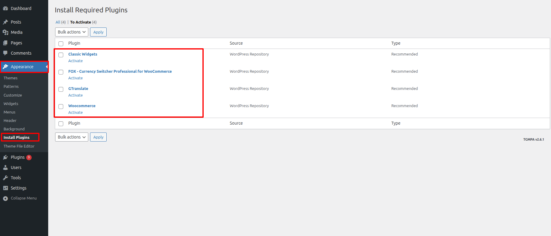 First Move ~ Refer to the "Dashboard" ~> then pick "Appearance" ~> afterwards "Install Plugins" ~> then Jump to "Select all Plugins" ~> and finally arrive at the "Install" ~> simply press "Activate" .
