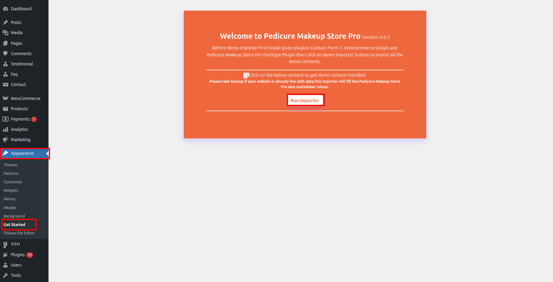First Move ~ Refer to the "Dashboard" then pick "Appearance" ~> then pick "Get Started" ~> simply press "Run Importer" .